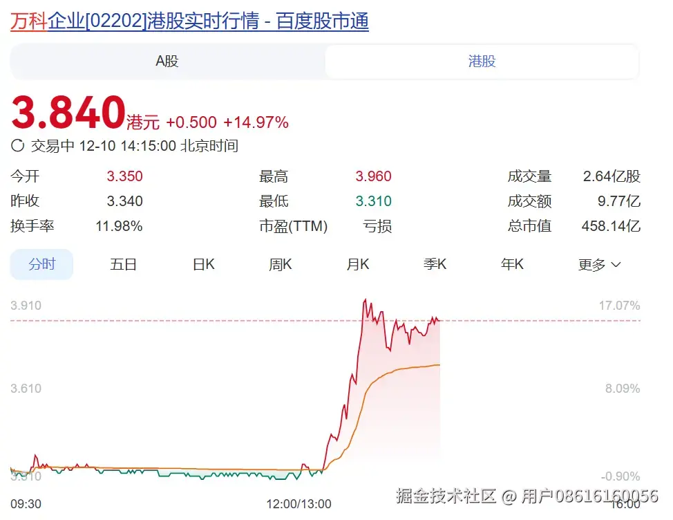 12月10日午后,万科A突然雄起,直线拉升涨停,港股万科企业暴涨约15%。