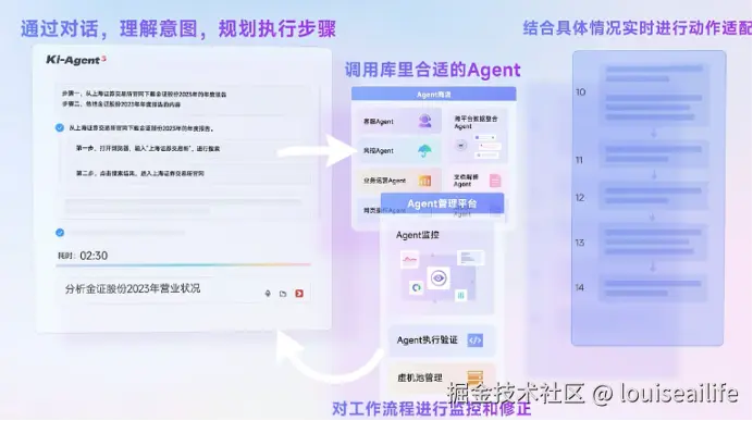 金智维的核心竞争力在于 “流程级智能体”与 RPA 深度融合。其 Ki-AgentS 等产品将大模型的认知规划能力与执行层的自动化引擎结合,使智能体不仅能“判断”,还能在既定规则下“执行并闭环”。这种以“数字员工”形式嵌入贷前审核、流水分析、报送与质检等高重复、高合规模块的做法,更贴合银行对稳定性、可审计性与运维可控性的实际要求。
