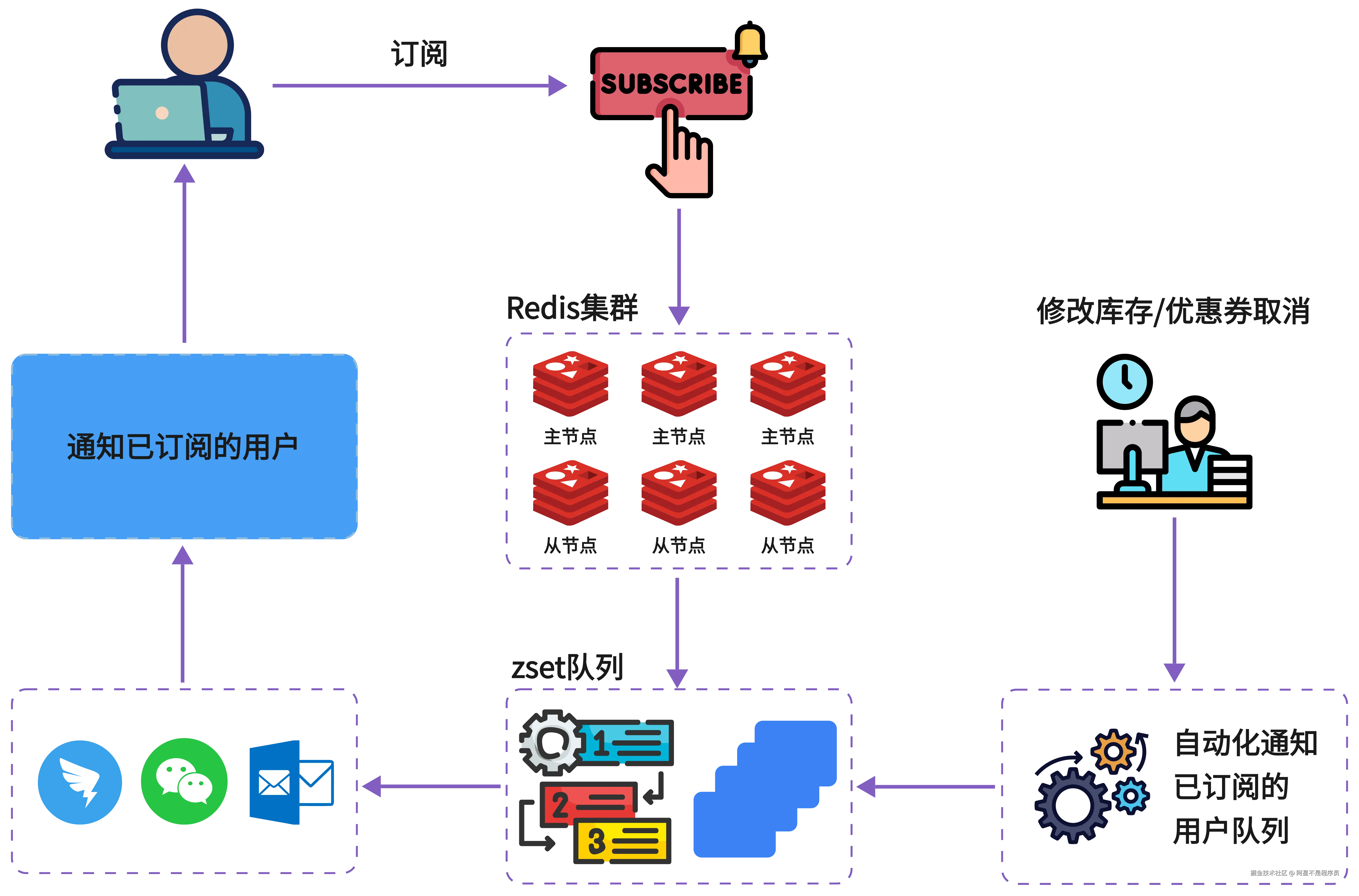 - 设计: 当库存不足时,用户加入订阅集合(ZSet,分值为订阅时间或优先级)。