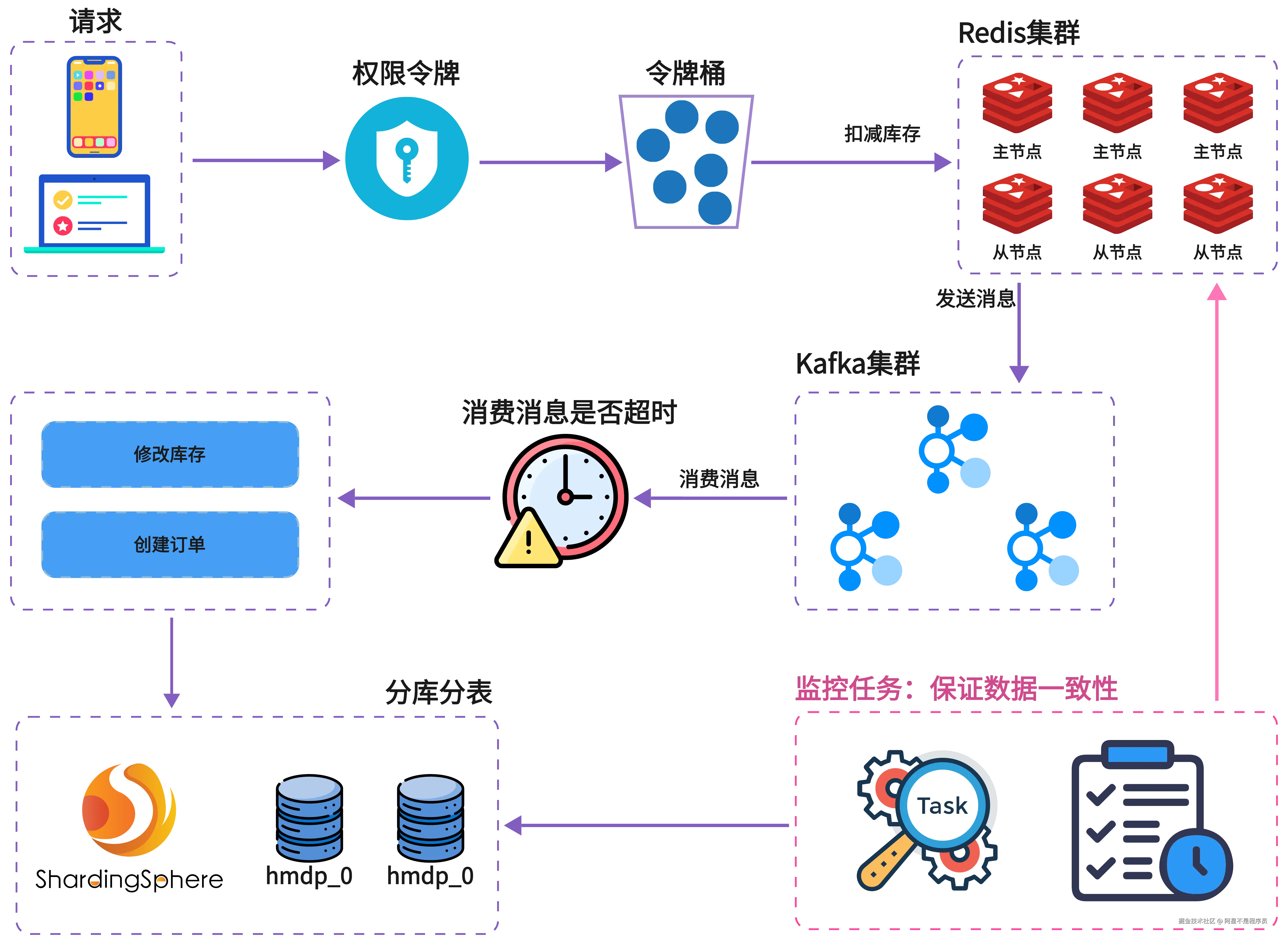 - 🔁 一致性闭环: Redis 扣减、订单创建、消息投递、数据库落库之间建立明确的状态流转与补偿策略。