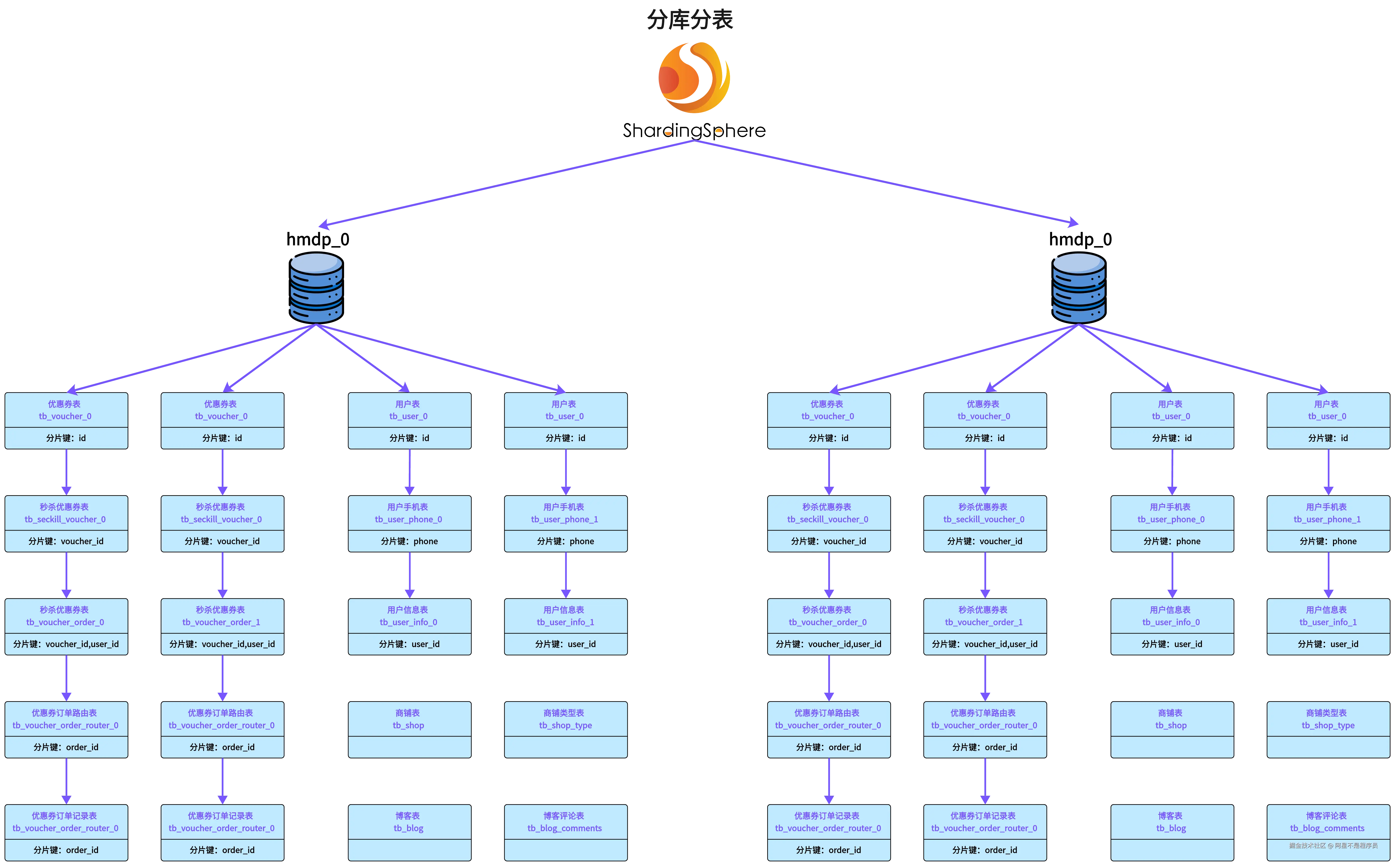 - 拆分对象: 用户表、用户信息表、用户手机号表、优惠券表、秒杀优惠券表、优惠券订单表、订单路由表、订单对账日志表。