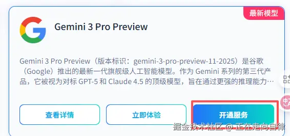 选择需要的大模型,点击开通服务(这里我以Gemini 3 Pro Preview为例子)。