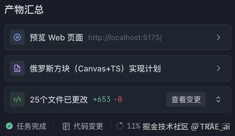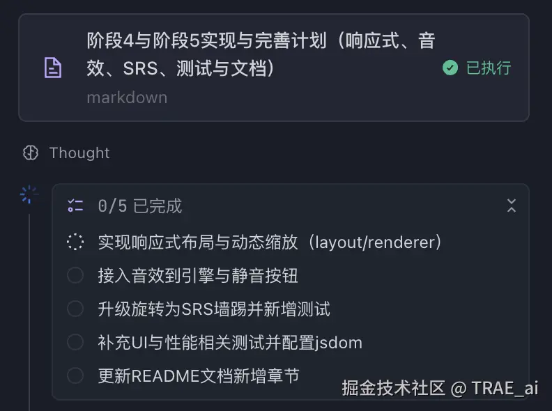 我们可以利用 SOLO Coder 的 Plan 功能先出具一份详尽的技术文档,搭建好游戏的“骨架”。第一轮迭代后,进行“复盘”,检查哪些任务已经完成,哪些尚未实现,并据此制定下一阶段的计划。这种结构化的推进方式,让开发者对整个项目的进度一目了然,非常有安全感,感觉项目始终在可控的轨道上推进。