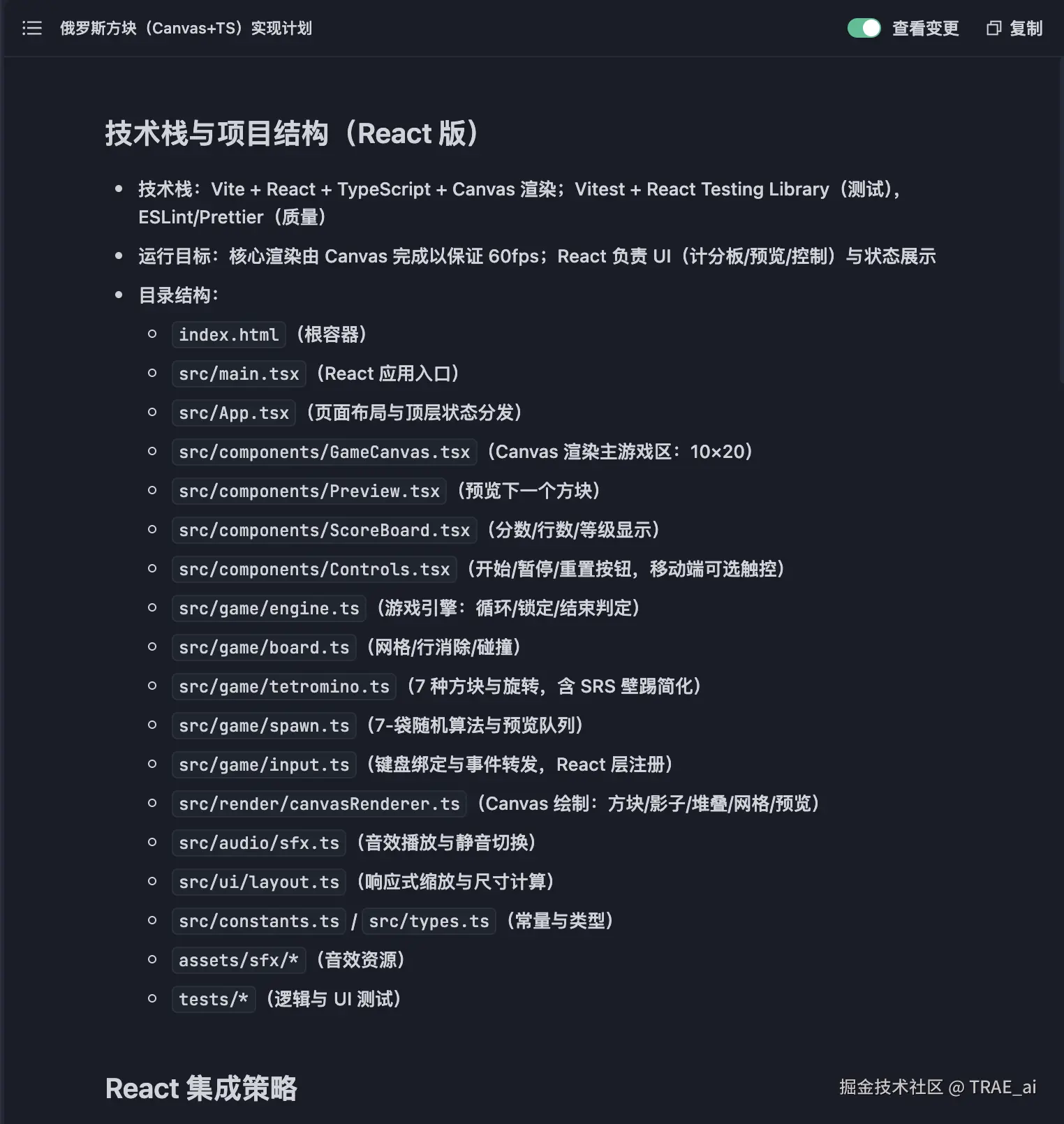 TRAE 随后生成了完整的技术文档,我们大概了解一下,直接继续。