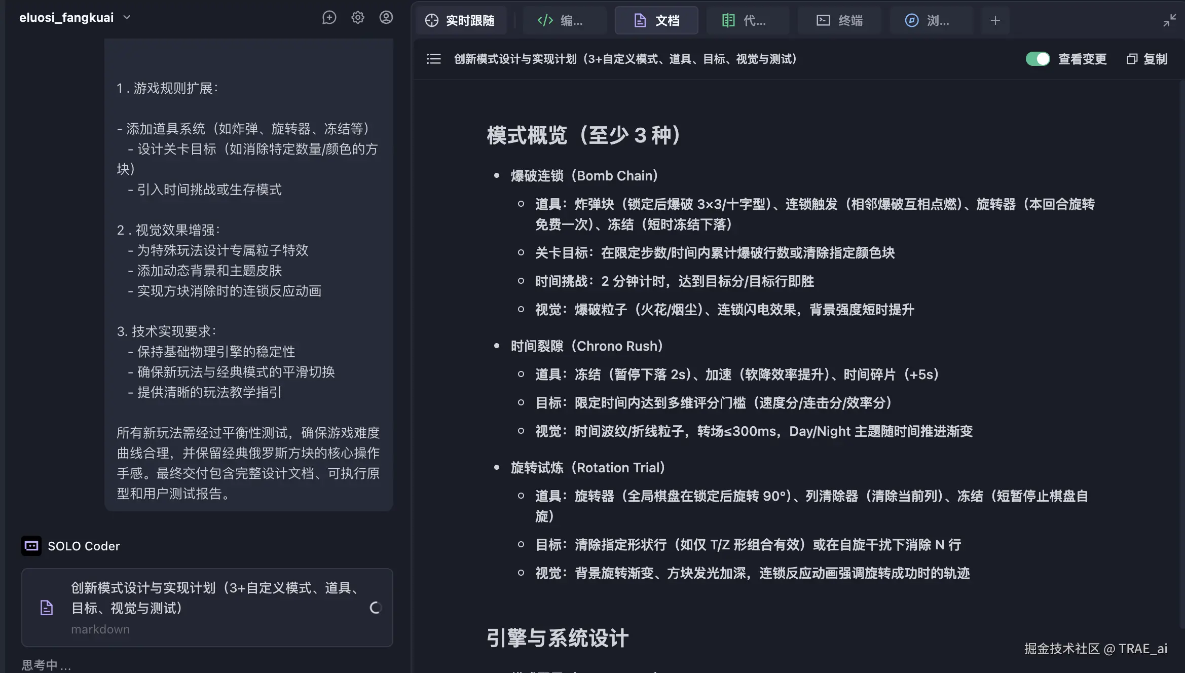 整个生成过程可以不懂技术概念。我的输入从最初的“开发一个经典的俄罗斯方块游戏”,到后来的“优化界面”、“增加玩法”,都只是自然语言描述。【提示词优化功能】会将这些需求“翻译”成专业的开发提示词,SOLO Coder 会生成技术文档,这极大地降低了创造的门槛。