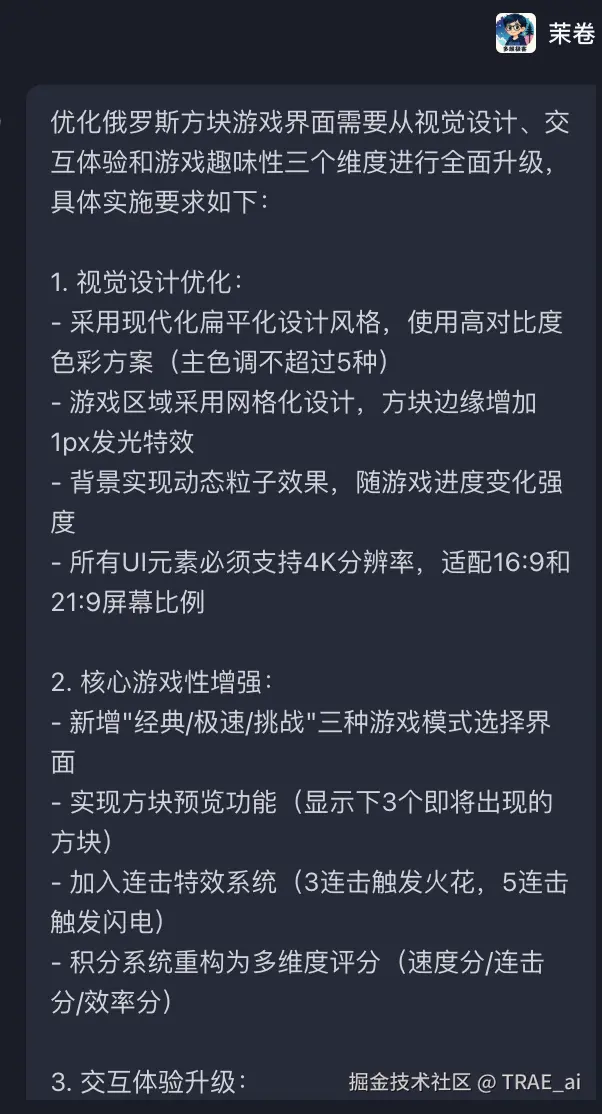 这时,TRAE 的提示词优化功能发挥了作用,将这句话扩展为一份详尽的专业需求文档: