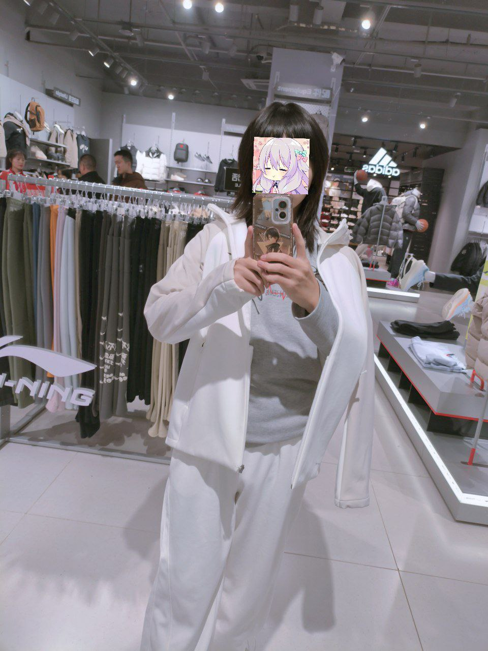 我问前台有没有白色的衣服,最好是外套。前台跟我说很少,然后把我领到女子健身的区域里去了…… 不是,哥们儿,男装真没有一件白色外套吗?不至于吧,应该不至于全黑吧。