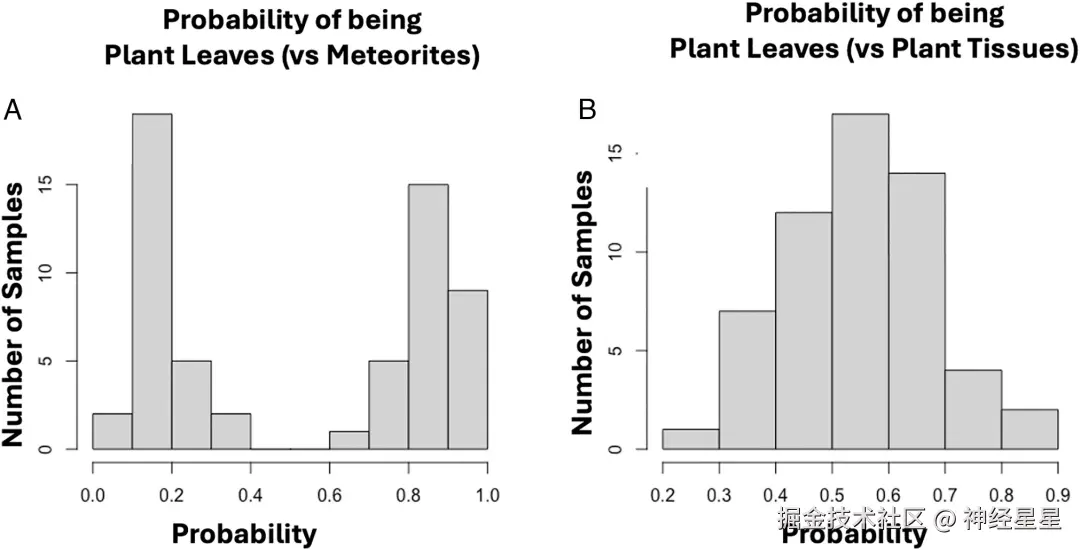 为了进一步说明该方法,论文给出了数个案例结果,表明该方法在不同案例区分时的高效和低效差异。如在第 3 组和第 8 组的案例中,即现代植物(光合组织)与陨石,该方法以 100% 的准确率将植物与陨石进行了区分, 所有样本的类别概率均 > 0.6 或 < 0.4,分子特征差异显著。如下图 A 所示: