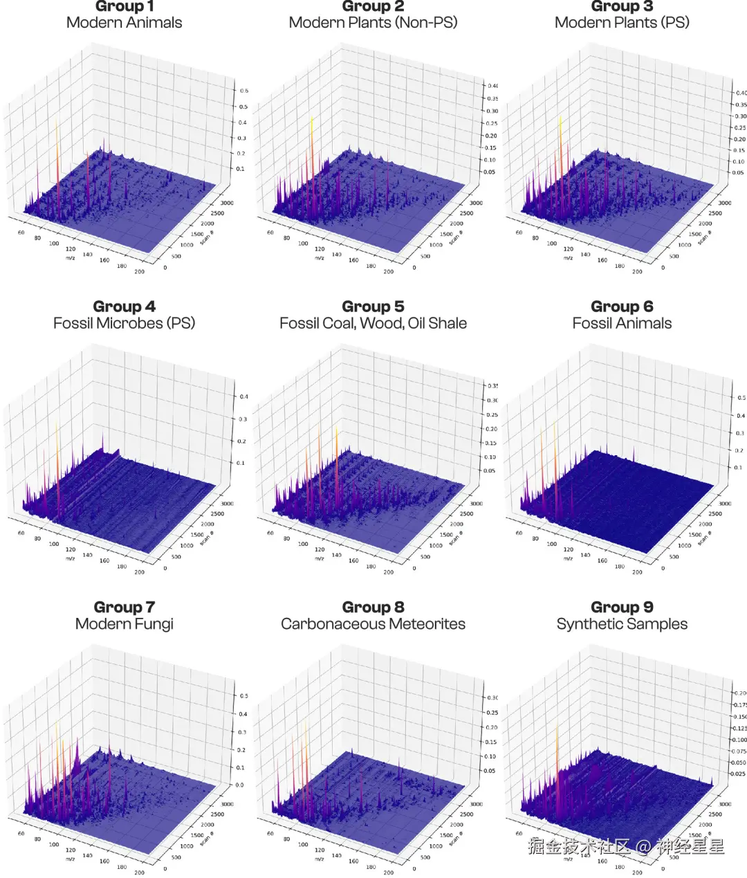 为了打破这一僵局,由美国卡内基科学研究所地球和行星实验室主导,联合全球多所院校和研究机构组成跨领域团队,提出一项「技术融合」的解决方案, 他们先使用热解气相色谱-质谱(pyrolysis–gas chromatography–mass spectrometry,py-GC-MS)进行分析,然后通过监督机器学习方法对分析数据进行分类判别,进而在混乱的分子碎片中捕捉古老的生命遗迹。