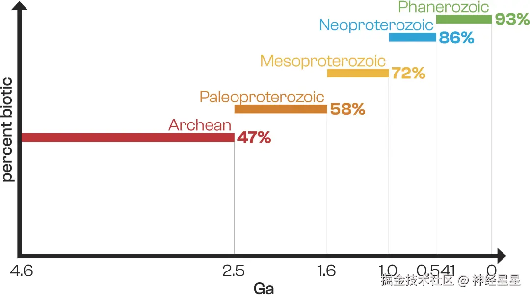 另外,结果还揭示了生物源样本比例随地质年代递减的规律,在 82 个显生宙样本中,76 个(93%)属于生物成因,元古代样本中有 43 个(73%),太古代的 45 个样本中仅有 21 个(47%)。显示了随年代增长,生物成因样本的百分比显著下降,可能反映了样本中生物分子降解或非生物源有机输入。如下图所示: