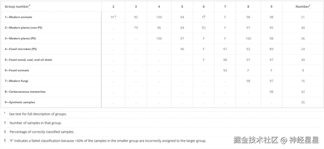 最后,剩余的 131 个样本主要为富含有机物的太古代或元古代沉积岩的酸溶富集残留物。这些样本的有机分子来源、生理特征存在未知或争议,但也因此为此次实验验证机器学习分析的应用提供了新的分类试验场。