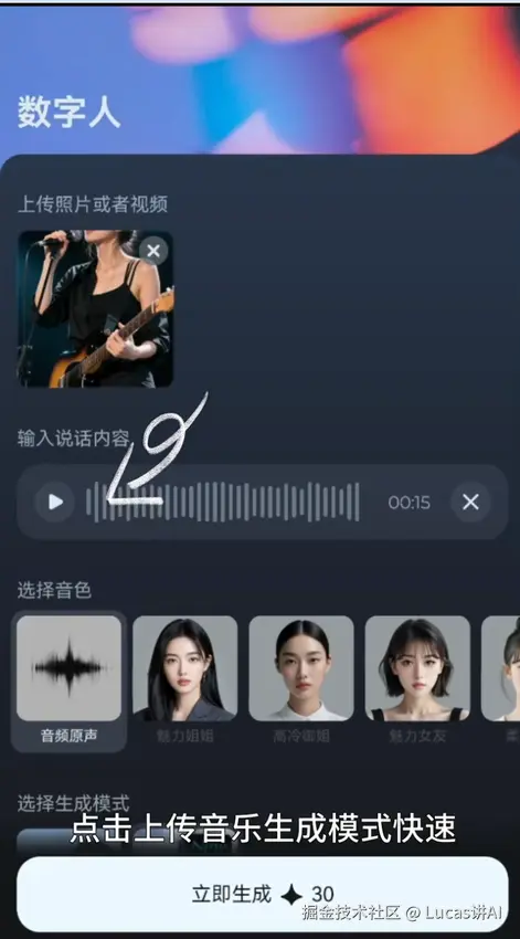 - 上传清晰的人物照片(最好是正面、光线好) → 让 AI 生成的数字人效果更真实。