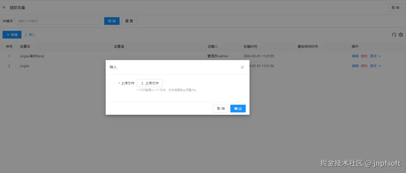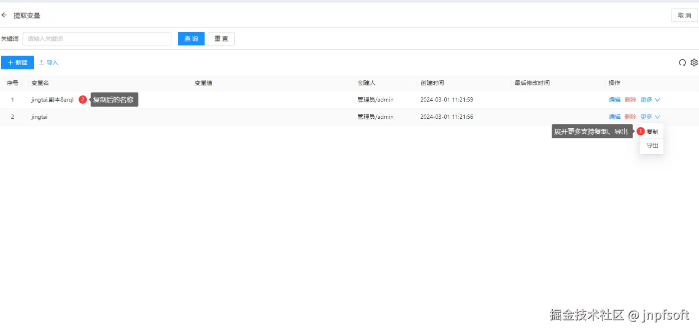 点击变量按钮进入提取变量页面,支持新建、查询(根据变量名关键词查询)、编辑、删除、更多(复制、导出)、导入功能,其中复制后的变量名以原名称后加上“.副本+随机五位数”命名