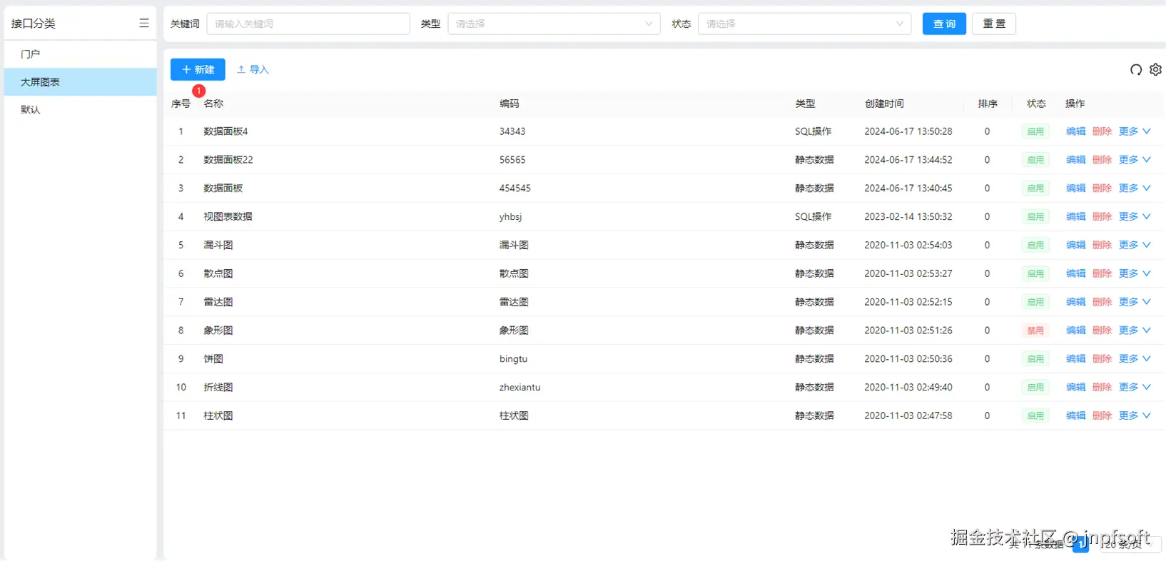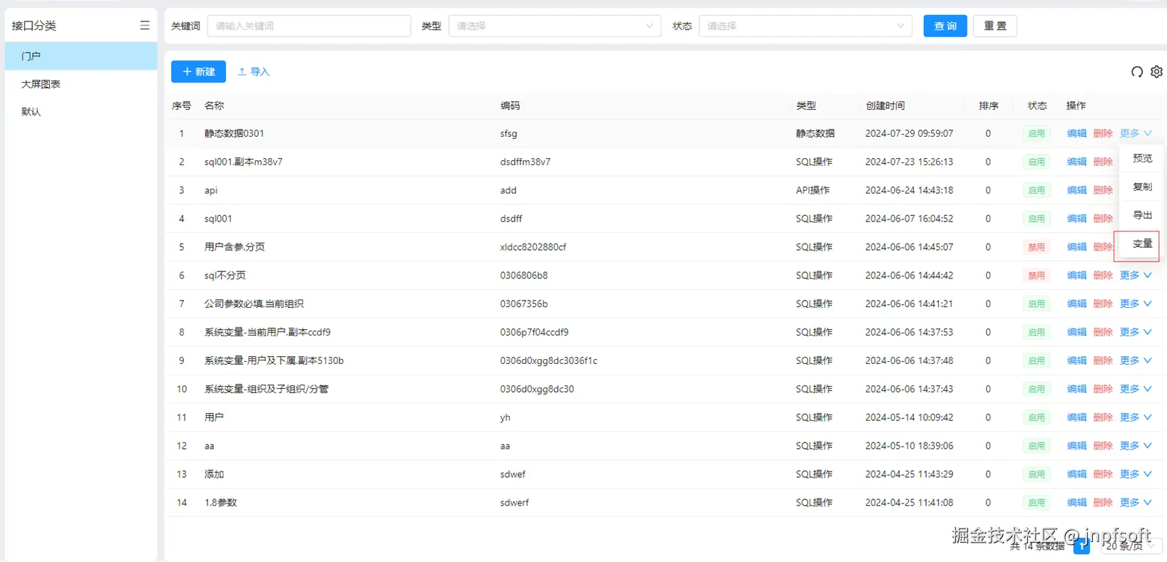 在【数据接口】页面,支持查询(根据名称或编码关键词、类型、状态查询)、重置、导入、刷新、新建等功能,并支持对数据编辑、删除、更多(复制、预览、导出)操作,其中复制后的名称以原名称后加上“.副表+随机五位数”