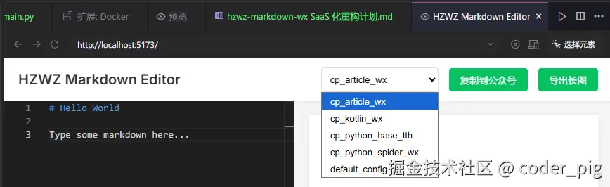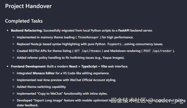 四年前,百无聊赖之余,一时兴起,花了差不多一周,用 Python 写了个 "🐭 尾汁Markdown转换工具" → coder-pig/hzwz-markdown-wx,用于:将Markdown文件转换成带样式的微信公众号文章HTML。