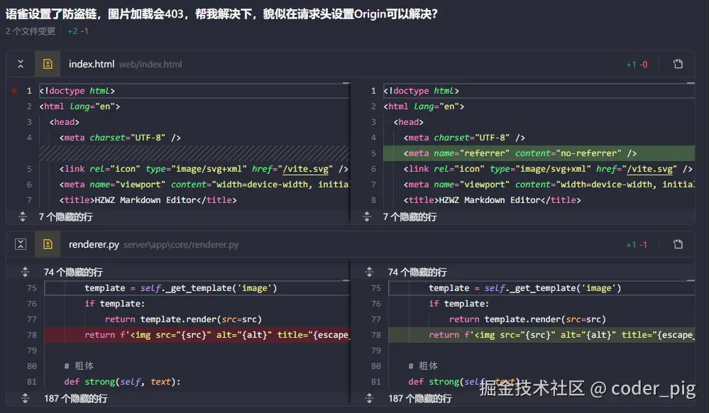 继续 Vibe,发现图片加载不出来,😄 这种大概率是 "图片防盗链",一般是检查 请求头 中的 Referer,如果是 第三方域名,就会返回 403:
