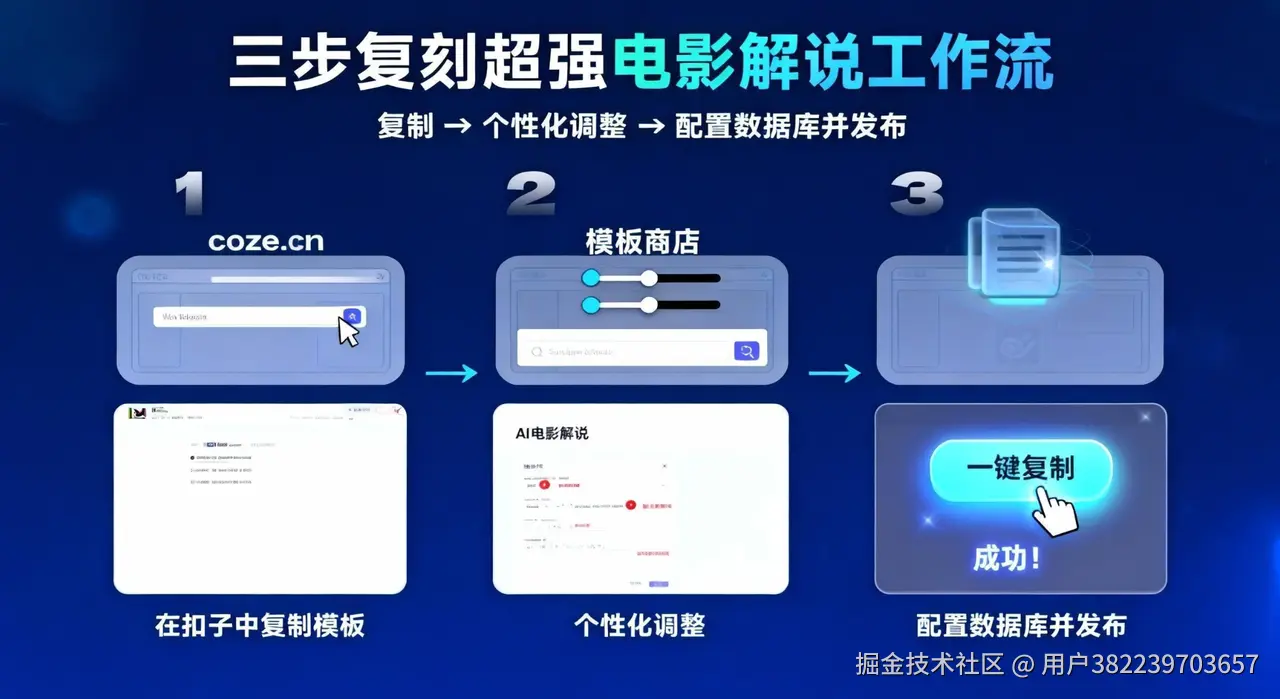 - 一键复制智能体 在 Coze 模板商店搜索关键词 “AI电影解说” ,找到模板并点击复制。这是承载你爆款算法的容器。