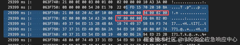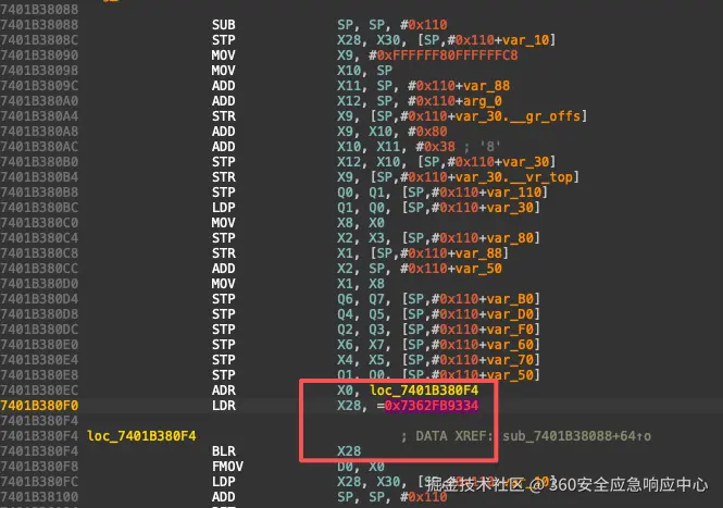 将上边内存空间dump出来,可以看到这段代码为跳板函数会跳转到0x7362fb934执行函数