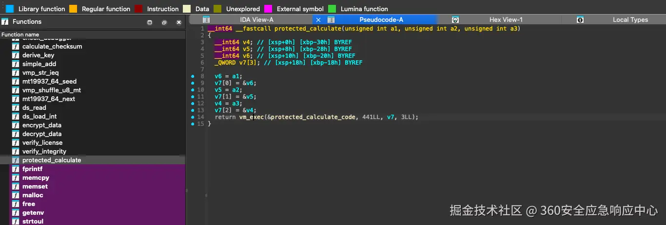 指令trace防护 1、采用 DexVM 与并对解密算法 VM 进行嵌套,将核心逻辑与算法执行流完全虚拟化,从而提升代码混淆强度并抵抗传统指令级分析,类似如下实现即可防护通过指令数量来快速定位代码块的方法