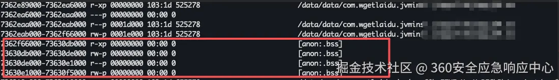 0x7362f对应在下边内存,通过以前对壳的分析,这段匿名内存是通过壳进行加载并匿名的实际逻辑实现