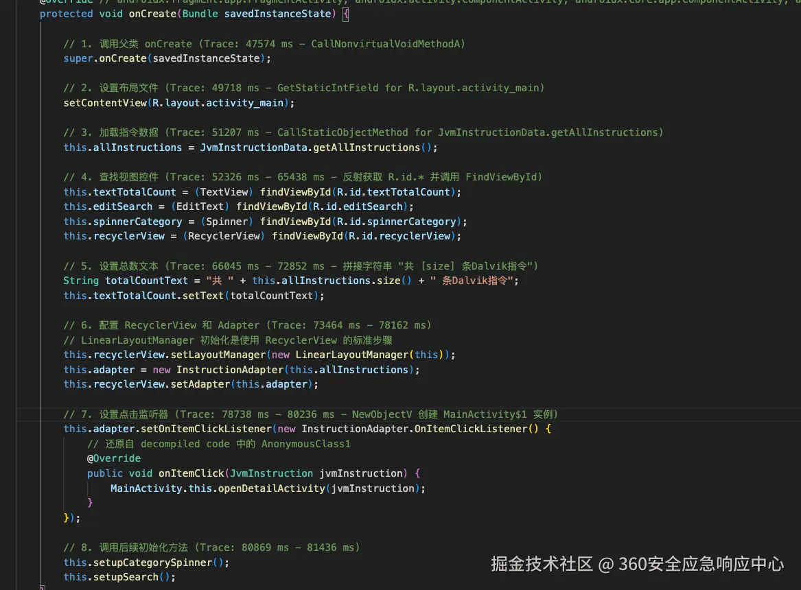 通过指令大小并结合trace进行快速定位代码块进行分析:通过分析oncreate函数开头以及指令大小定位内存加密后的oncreate函数指令位置,此 oncreate函数存在58条指令 源码开头: