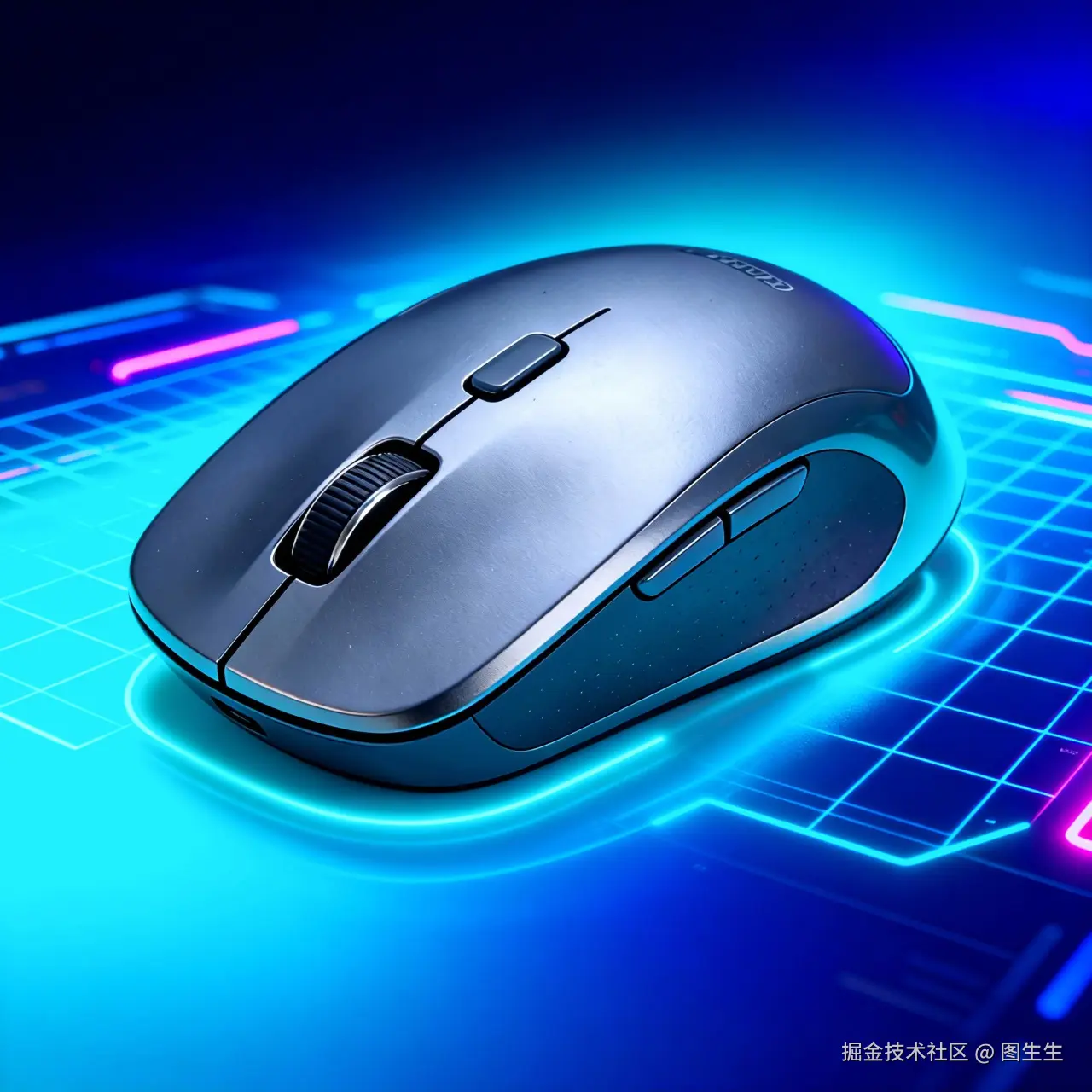 成果:生成的图片将鼠标与霓虹背景自然融合,蓝青霓虹光效烘托出强烈科技氛围,既能凸显3C产品的科技属性,又能直观展现人体工学设计优势,比专业设计软件做出来的效果更自然。