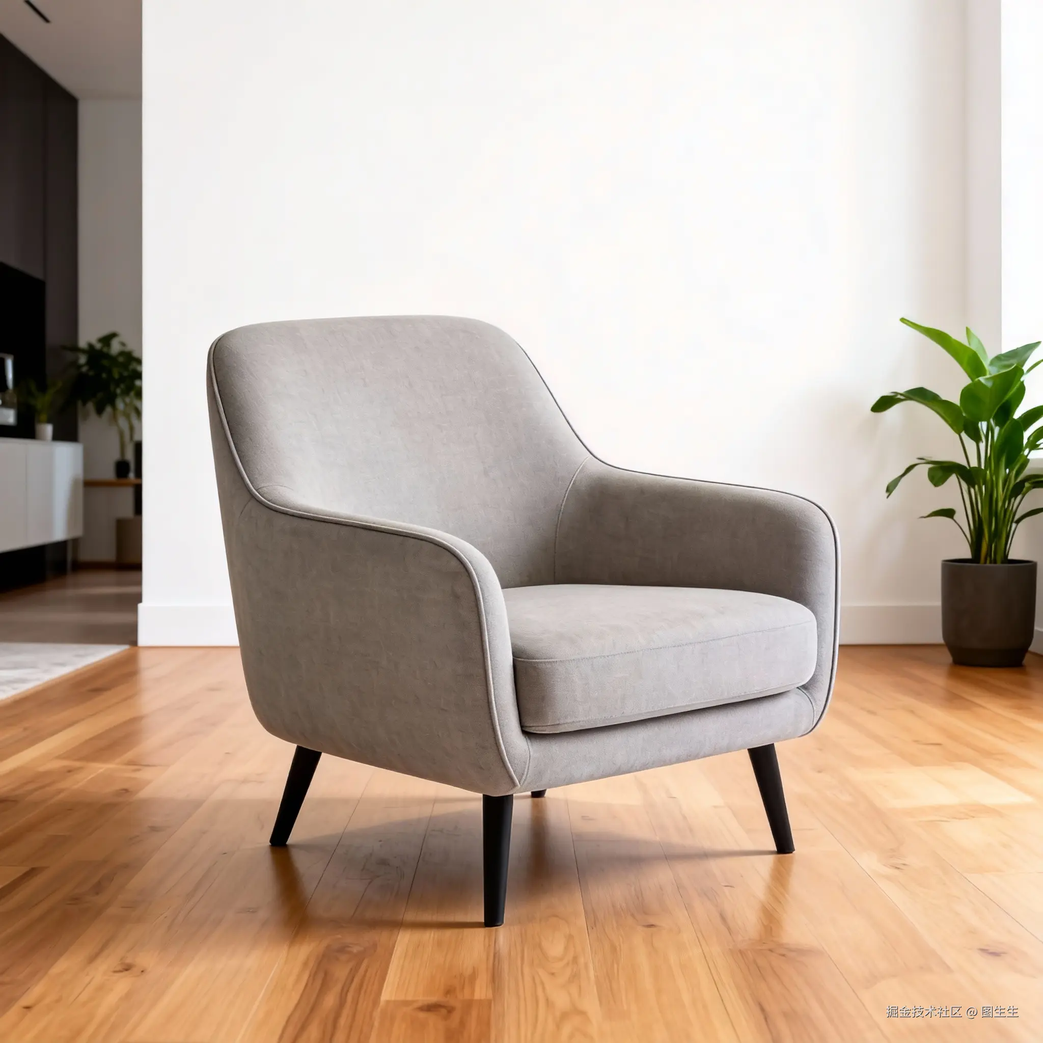 AI提示词: 现代简约客厅场景(原木色地板+白色墙面+绿植点缀)