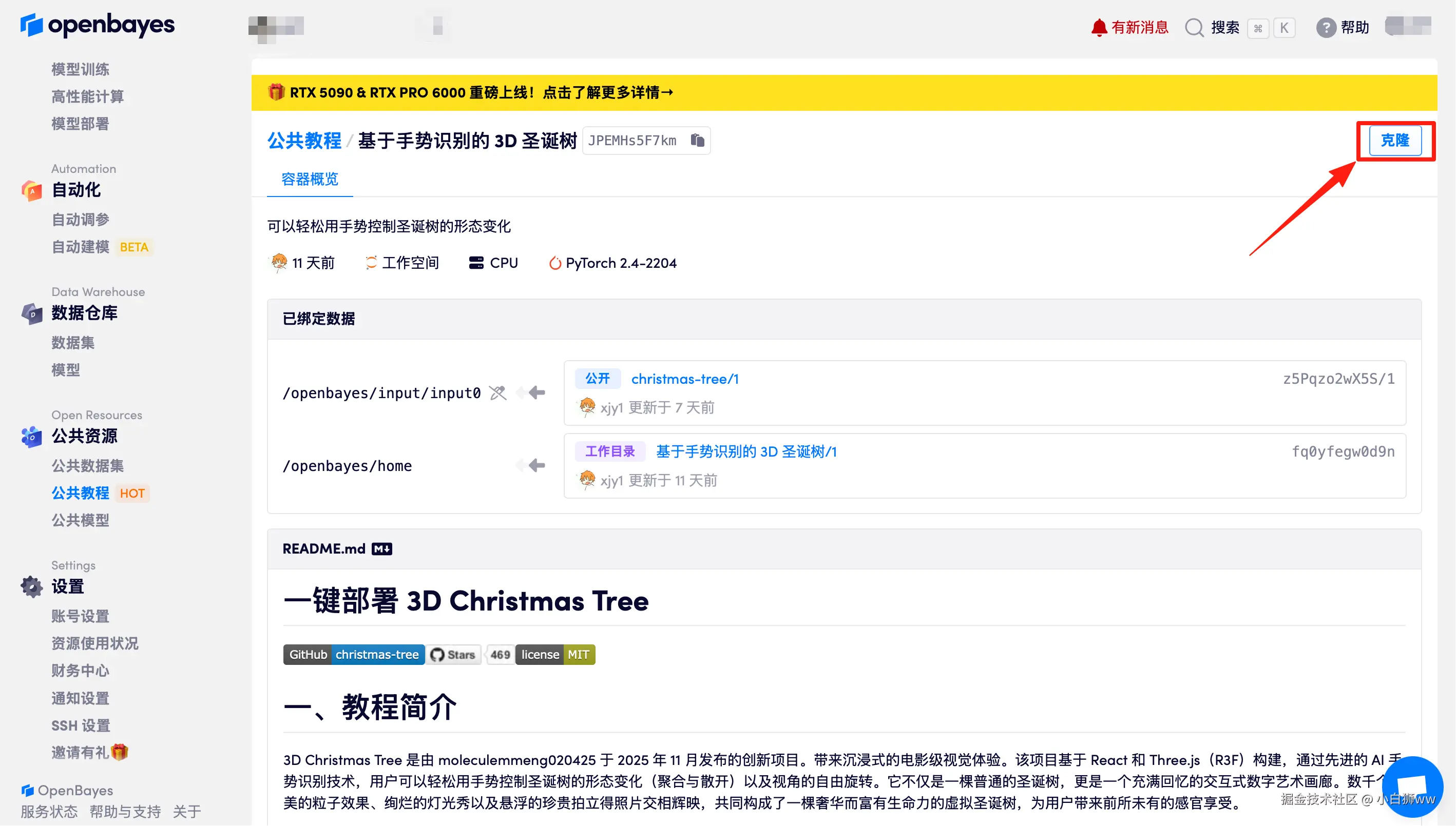 页面跳转后,点击右上角「克隆」,将该教程克隆至自己的容器中。