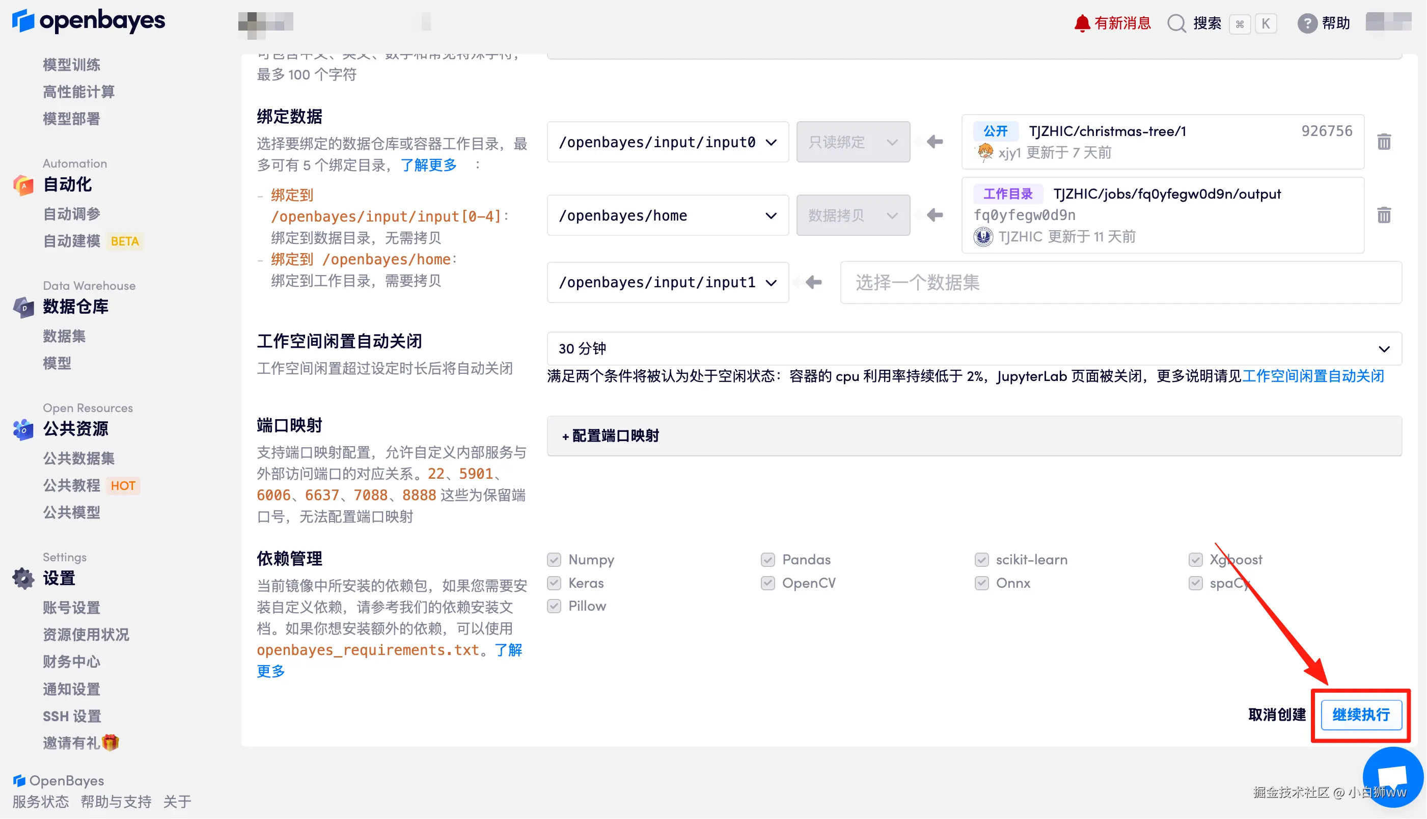 在当前页面中看到的算力资源均可以在平台一键选择使用。平台会默认选配好原教程所使用的算力资源、镜像版本,不需要再进行手动选择。点击「继续执行」,等待分配资源。