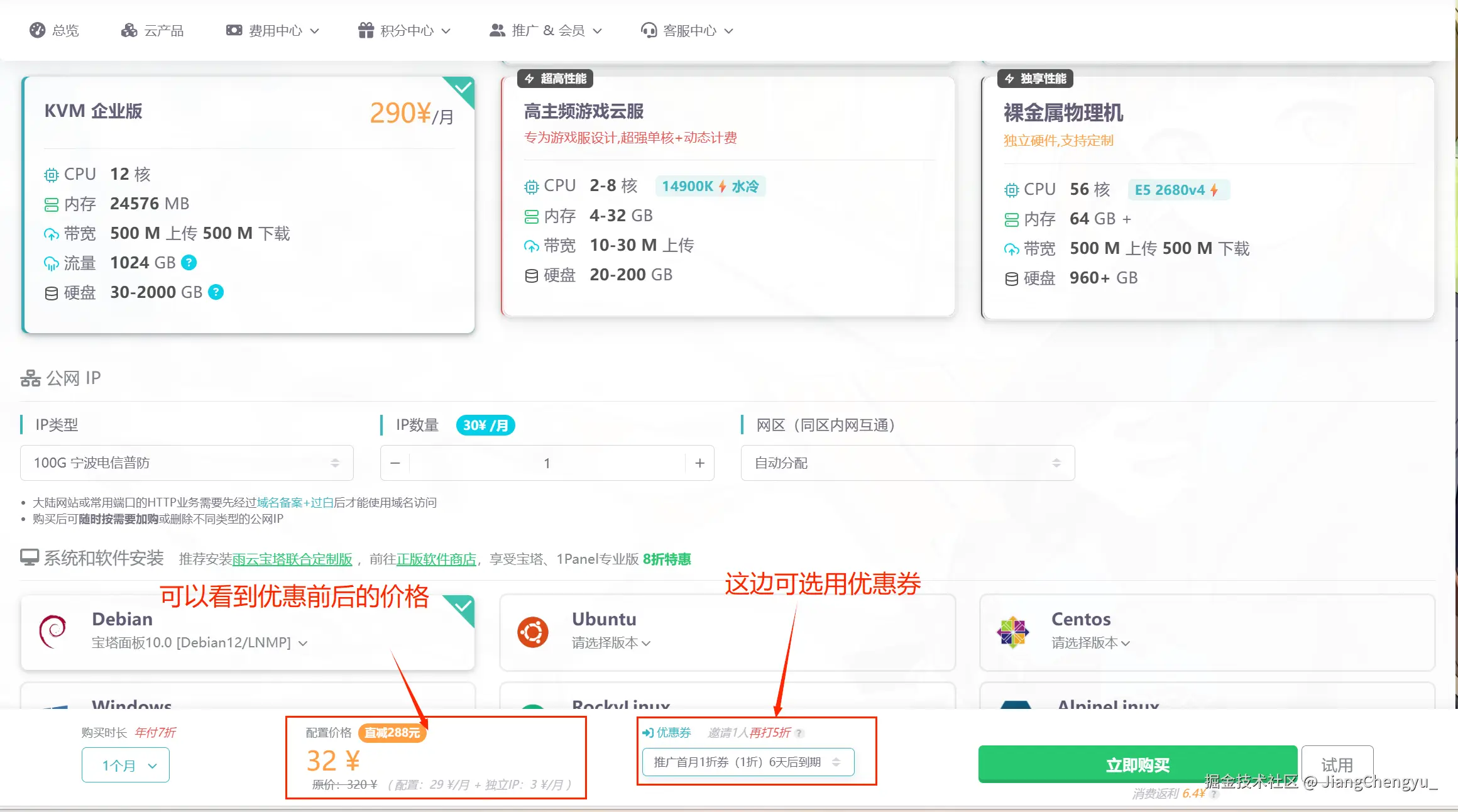到云服务器配置选择页面,选择好配置后,在下方即可看到优惠券选用和优惠前后的价格;