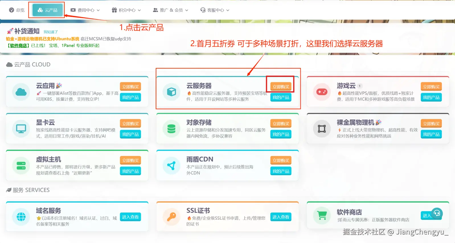 当然,雨云发放的优惠不只是这一点,后面的文章会讲其他方面的优惠、云产品试用、游戏服务器搭建等。
