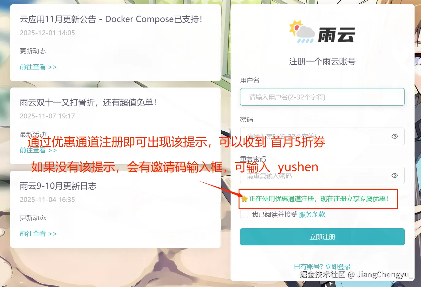 本篇主要介绍了雨云新用户注册送 首月五折券。
