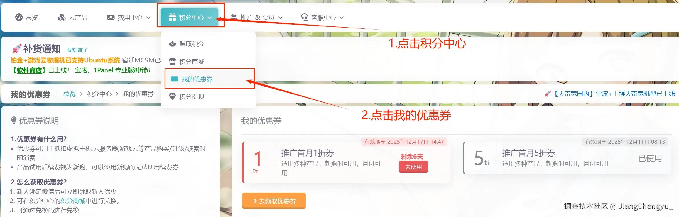 新人通过优惠通道注册即可获取到 首月 5折优惠券 ,再邀请三人注册并产生消费后可以获取到 首月1折优惠券,更一步的降低了服务器学习、实践的成本。