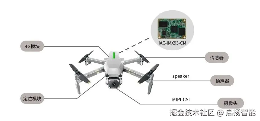 无人机需要实时分析图像与视频信息,完成“人物车”自动识别,实现无人值守、自主巡逻、目标跟踪等功能,启扬IMX93核心板集成双核Cortex-A55+ 单核Cortex-M33,多核异构、兼具出色的多任务处理和实时性能,内置0.5TNPU,能够完成本地轻量级AI处理任务。