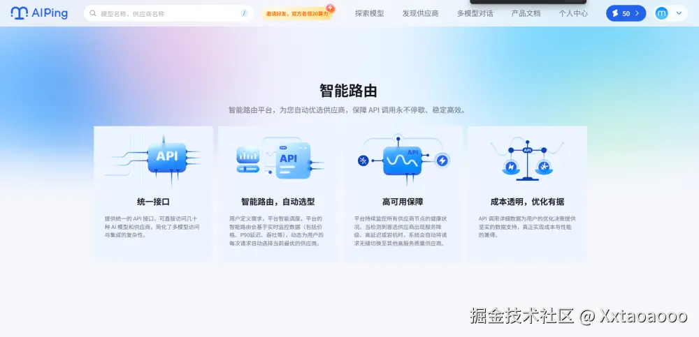 针对“每换一个模型就要重写一套对接代码”的痛点,AI Ping 提供统一 API 接口,开发者只需一次集成,即可无缝访问平台上所有已接入的模型服务,彻底告别多平台切换与重复开发。更进一步,平台还推出API 智能路由功能:开发者调用大模型服务时,希望“省时省力地获得兼顾速度与成本的选择”,该功能可根据用户的意向模型,**帮助用户在众多大模型API服务平中智能选择最优供应商:用户只需明确自身业务需求(如响应速度优先级、成本控制目标等),平台便会开启智能调度模式——基于实时监控的多维度数据(包括各供应商的服务价格、P90 延迟、吞吐能力等),结合负载均衡与成本优化算法,为每一次请求动态匹配当前最优供应商。**其中,业务高峰期优先选择吞吐能力强、延迟低的供应商,保障服务流畅不卡顿;非高峰时段自动切换至性价比更高的选项,帮助开发者节省成本与时间。