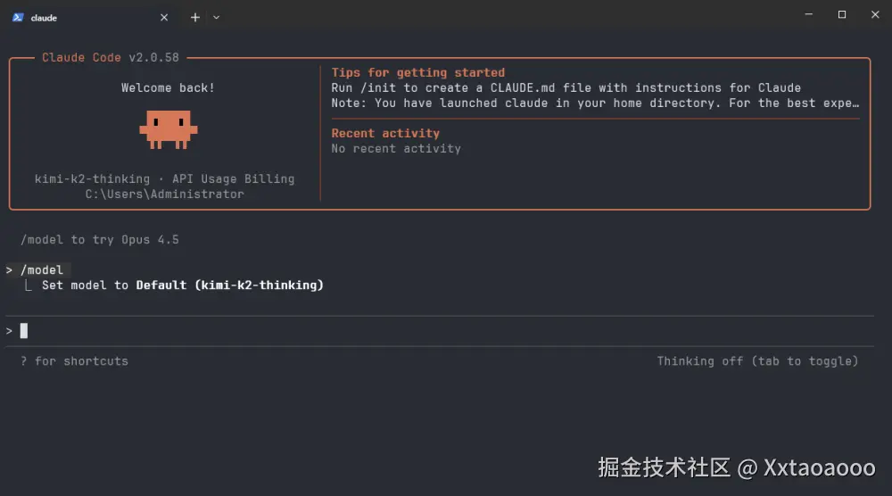 启动后,选择 “信任此文件夹 (Trust This Folder)”,以允许 Claude Code 访问该文件夹中的文件,随后开始在 Claude Code 中使用 Kimi-K2-Thinking。