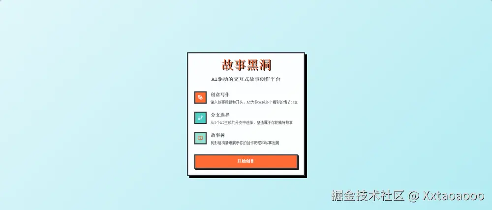 我需要开发一款Ai小说创作平台,名称为智能小说创作家,流程是用户提供故事的标题和50-200字左右的小说故事开头,提供完应用会调用GLM-4.6模型,生成后续五个情节分支概览,用户可以任意选择某一分支。选择分支之后立马调用GLM-4.6生成具体的情节,大约300-500百字左右。未被选择的分支废弃,同时用户还可以手动修改分支内容创作,选择的分支使用树形结构一级一级往下展示,但是始终展示当前的分支,持续重复。采用React技术,风格使用新粗野风格,多用白色、橙色、绿色、蓝色、灰色等,流畅的交互设计。无需登录,只需要几个页面即可,首页核心创作功能,API Key 的配置页面(保存到本地的local storage中)。