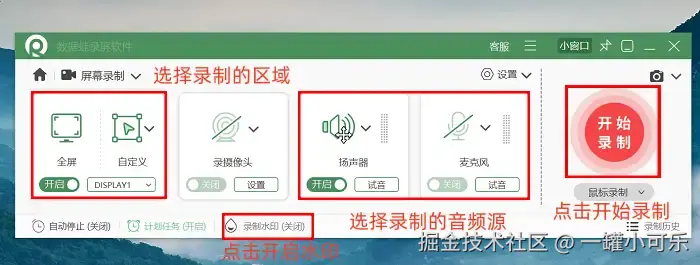 步骤2:进入屏幕录制专属界面后,你可以根据需求灵活调整录制范围(全屏、特定窗口或手动框选的自定义区域都能选) ;声音选项也支持精准控制,比如只录系统内声音、只录麦克风人声,或是两者同时收录。