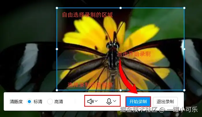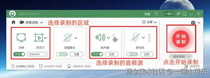 步骤2:接下来需要调整好合适的屏幕录制区域,同时按需选择音频来源 (可以单独录制系统声音、麦克风声音,或同时收录两者) 。如果还需要精细化调整视频属性,就点击 “输出设置” ,对视频质量、格式、帧率等参数进行自定义。所有设置确认无误后,点击 “开始录制” 按钮,录屏便会正式启动了。