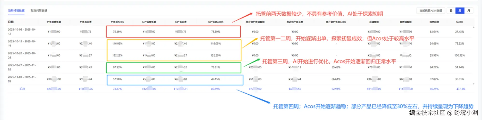 针对卖家的困境,DeepBI启动合作服务,首要面临的是新手卖家初期数据不足的天然难题。新品阶段,该卖家的产品刚开售,缺乏足够的真实点击与转化数据,导致DeepBI的AI系统在探索期出现短暂的ACOS上升情况,这让本就有预算焦虑的卖家产生了明显的焦虑情绪,甚至对工具效果提出质疑。