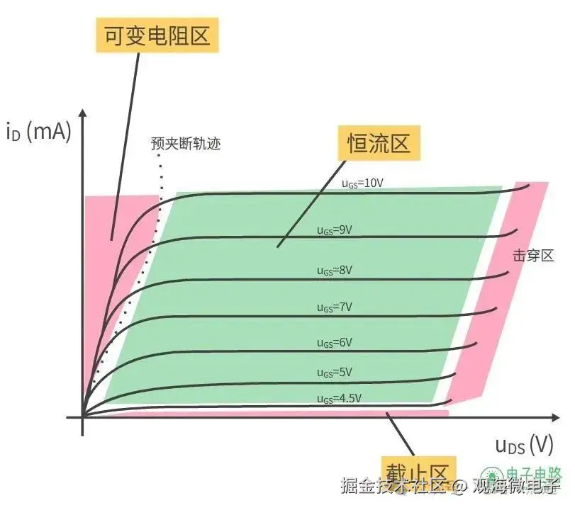 击穿区在输出特性左边区域,随着Uds增大,PN结承受太大的反向电压而被击穿,工作时应该避免让管子工作在该区域。
