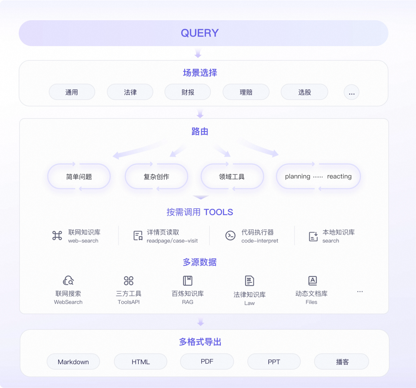 覆盖从深度搜索到深度研究、创作的全流程,实现 “信息获取 - 深度分析 - 成果输出” 的闭环支撑