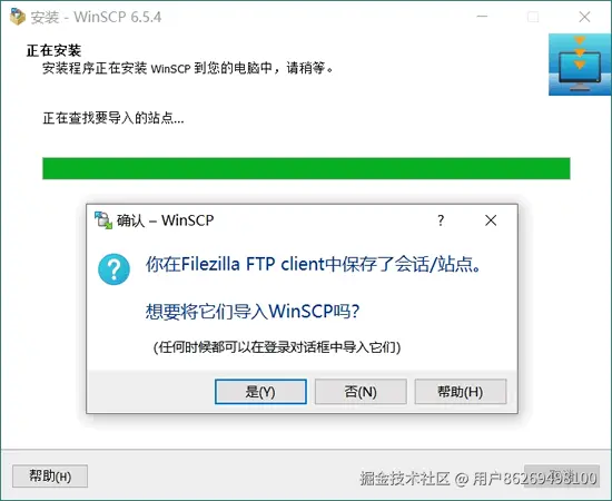 ⑨ 等待安装完成。如果电脑安装了 PuTTY 或者 Filezilla,会自动弹出“是否导入站点”对话框,点“是”可以自动同步保存的 SSH 会话: