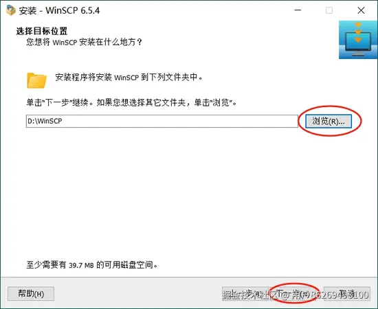④ 在下图窗口中,点击“浏览”按钮可以自定义 WinSCP 的安装位置,这里建议安装到除 C 盘以外的其它盘里,比如笔者选择安装到 D 盘。然后点击“下一步”:
