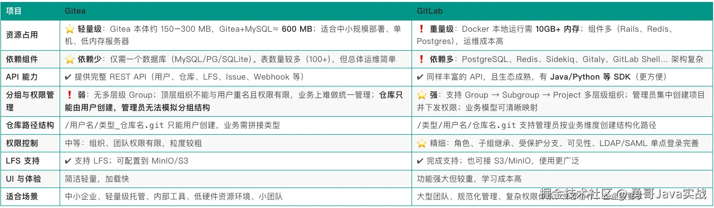 上图是笔者调研 Gitea 和 GItlab 的对比图,相比之下 ,Gitea 真是轻量级神器 ,能够完美适配公司业务的需求。