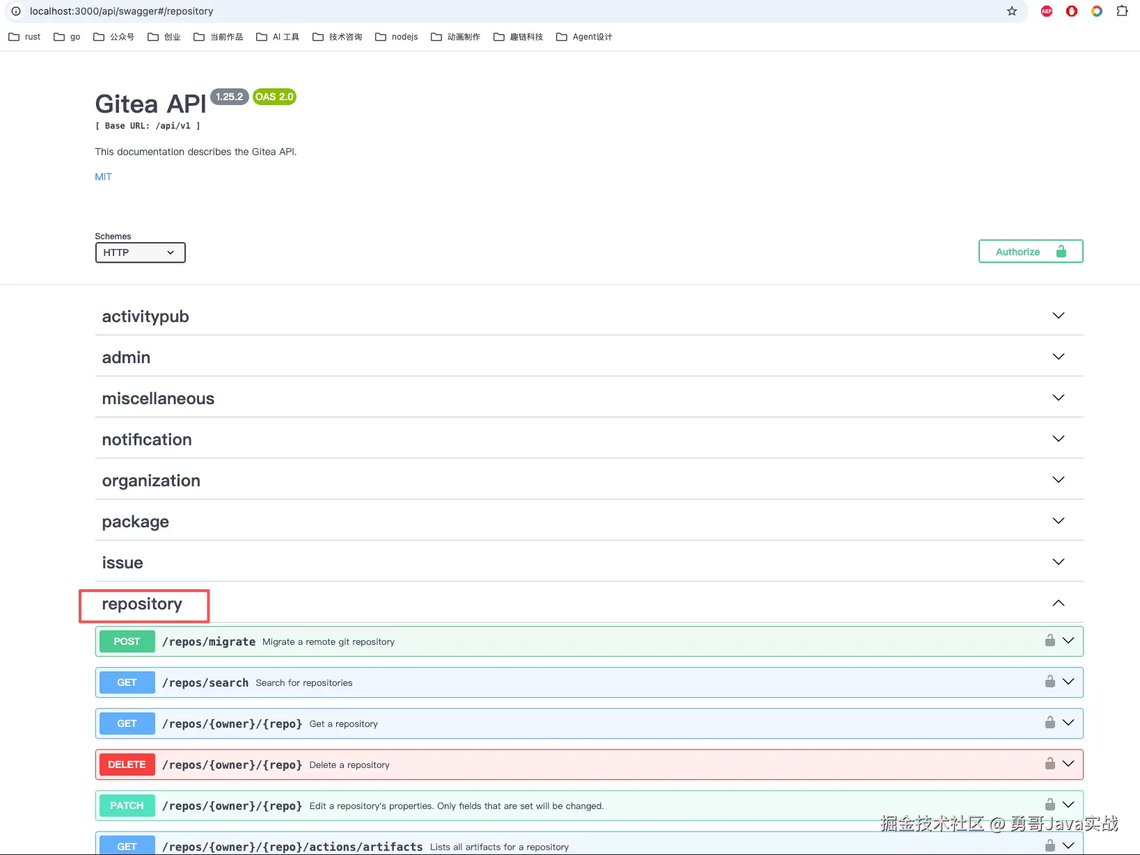 如图,当我们访问:http://localhost:3000/api/swagger#/repository , 可以查看所有的 Gitea 开发 API 。