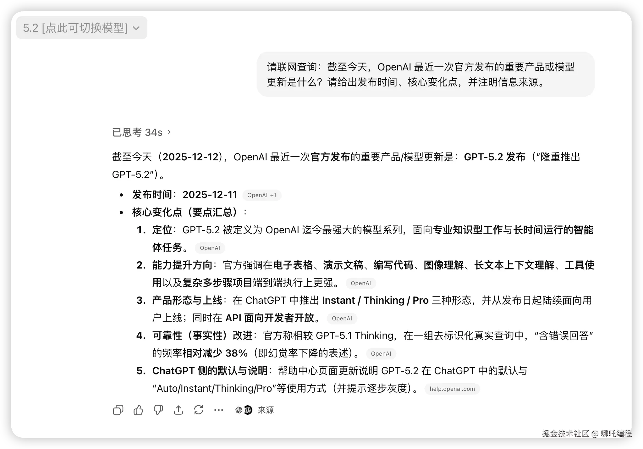 OpenAI 最新发布的 GPT-5.2 整体更聪明、更可靠,尤其是在减少“胡说”方面进步明显。