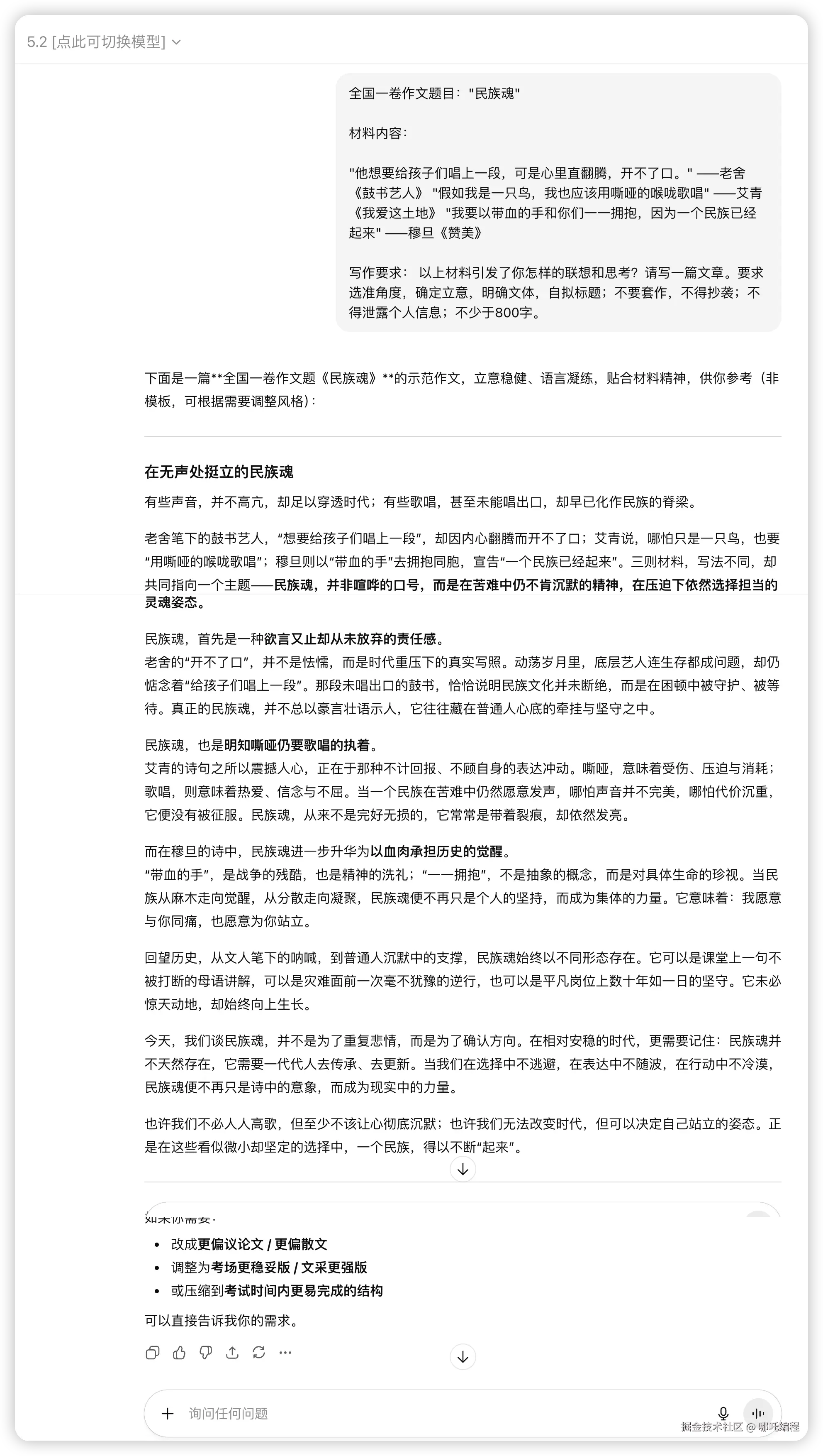 全国一卷作文题目:"民族魂" 材料内容: "他想要给孩子们唱上一段,可是心里直翻腾,开不了口。" ——老舍《鼓书艺人》 "假如我是一只鸟,我也应该用嘶哑的喉咙歌唱" ——艾青《我爱这土地》 "我要以带血的手和你们一一拥抱,因为一个民族已经起来" ——穆旦《赞美》 写作要求: 以上材料引发了你怎样的联想和思考?请写一篇文章。 要求选准角度,确定立意,明确文体,自拟标题;不要套作,不得抄袭;不得泄露个人信息;不少于800字。