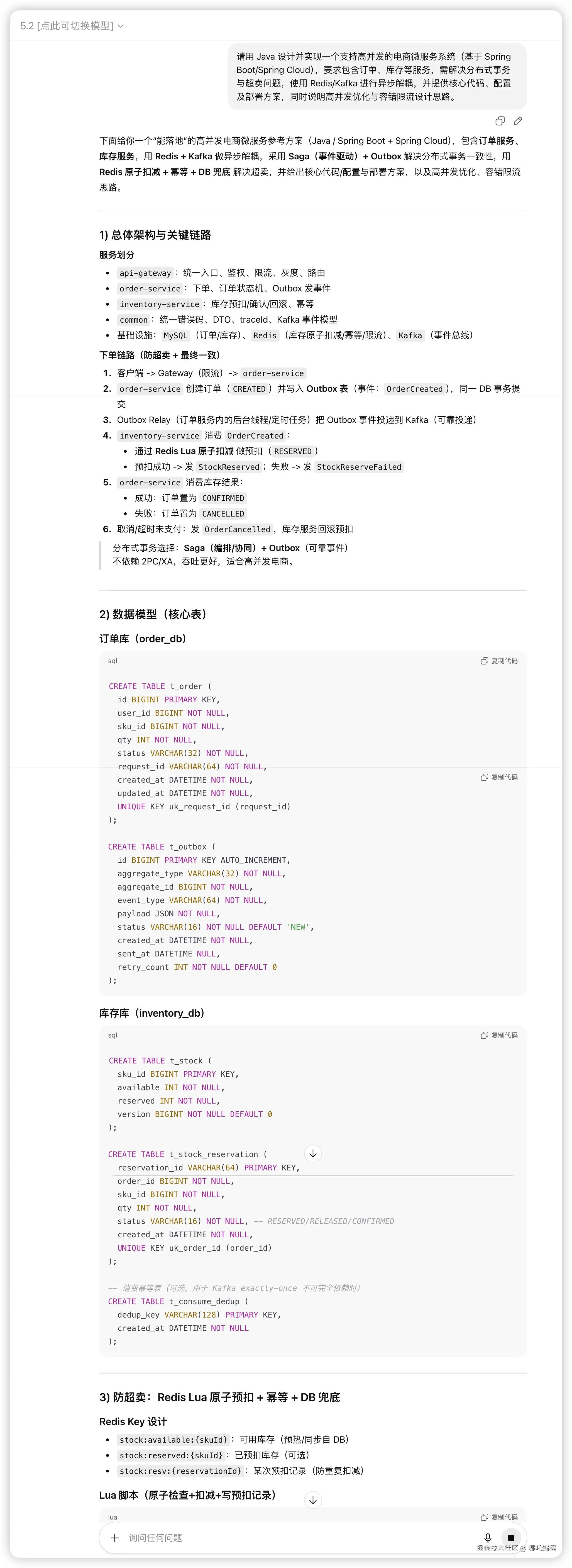 提示词:请用 Java 设计并实现一个支持高并发的电商微服务系统(基于 Spring Boot/Spring Cloud),要求包含订单、库存等服务,需解决分布式事务与超卖问题,使用 Redis/Kafka 进行异步解耦,并提供核心代码、配置及部署方案,同时说明高并发优化与容错限流设计思路。