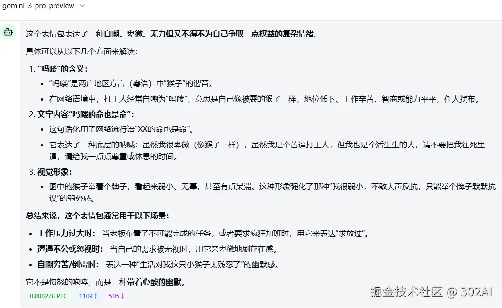 再来看看依然稳定发挥的 Gemini 3 Pro 的回答,从幽默感和“个性”来讲,与 Gemini 3 Pro 的对比显得 GLM-4.6V 的输出较为理性务实